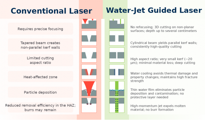 As summarized in Fig. 3, WJGL uses water as the transmission medium and a concurrent coolant, significantly reducing HAZ and suppressing distortion and microcracking, thereby improving precision and edge/surface quality (see Fig. 4). Its advantages can be summarized as follows: